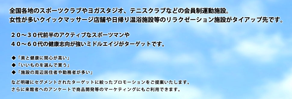 「美と健康に関心が高い」「比較的経済的に余裕がある」「施設周辺に居住や勤務先がある」など明確にセグメントされた人々が集まっており、ここにダイレクトにアプローチが可能です。